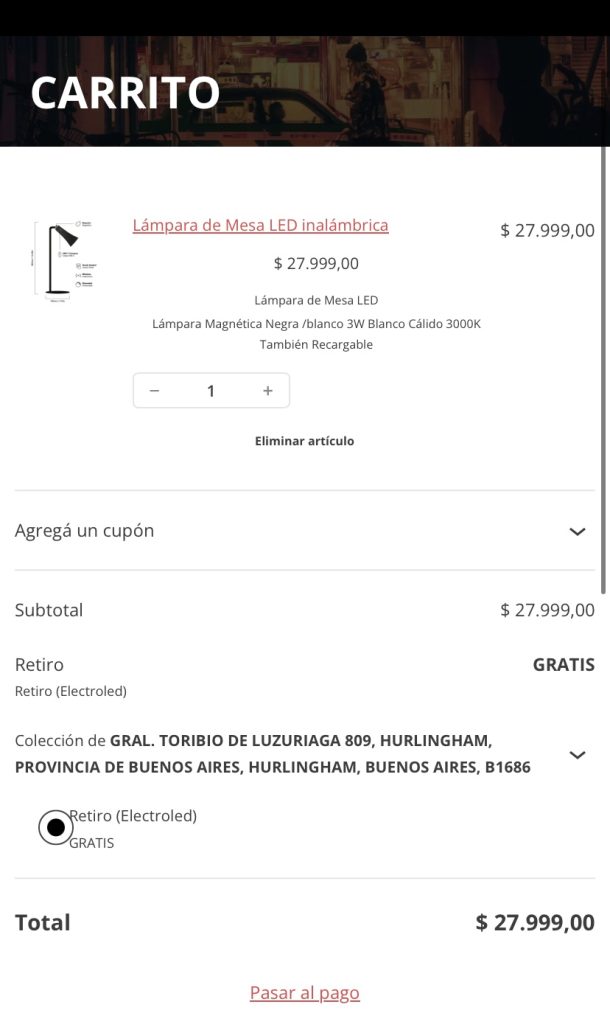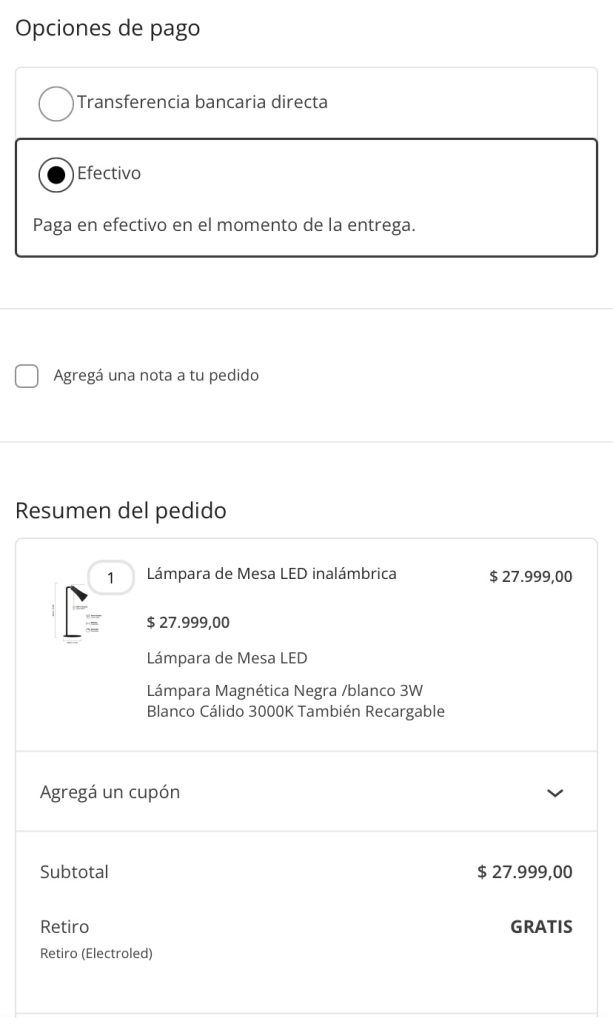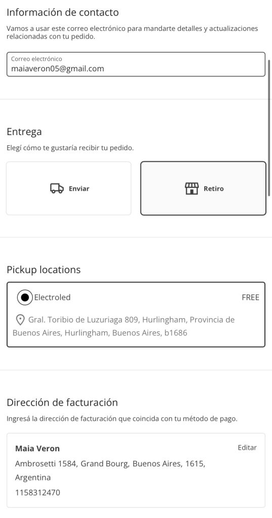 2. Una vez ya en el carrito, hay que seleccionar la forma de envio (a domicilio o retiro por local) y completar con los datos necesarios.