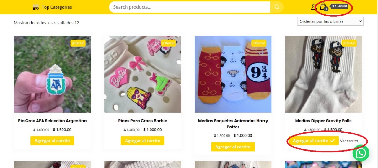 1- En la tienda, elegir el producto a comprar y agregar al carrito, los seleccionados se verán reflejados arriba .