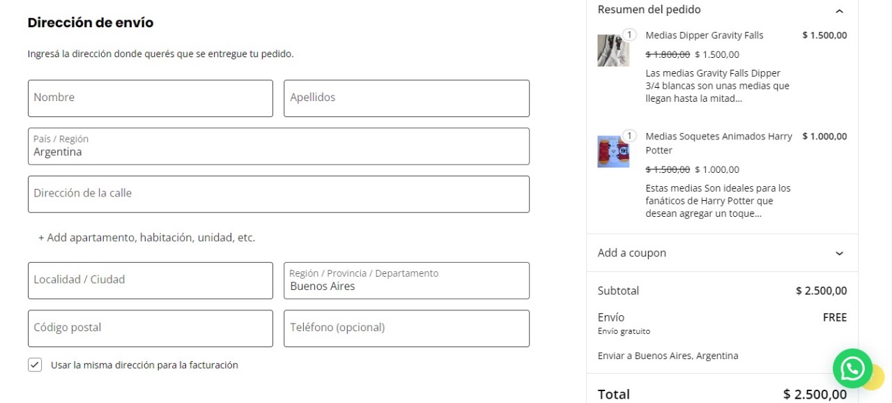 4-Si clickeamos en “Finalizar compra” nos va a redirigir a la siguiente ventana donde podrá ver su pedido, el valor y deberá completar con los datos de donde quiere recibir/retirar el producto.
