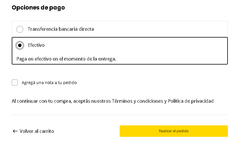 5- Seleccionamos el método envío, pago que corresponda y realizamos el pedido.